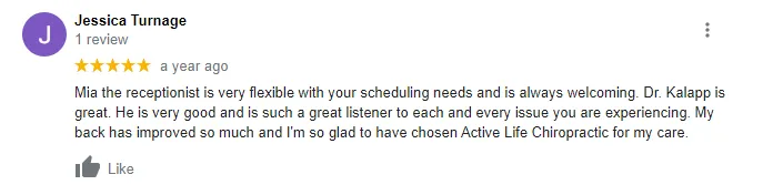 Disclaimer: Procedures and treatments performed by XX - Active Life Chiropractic have an inherent success (and failure) rate. Reviews, testimonials and content on this site should not be interpreted as a statement of efficacy of procedures and treatments performed by XX - Active Life Chiropractic for anyone else.